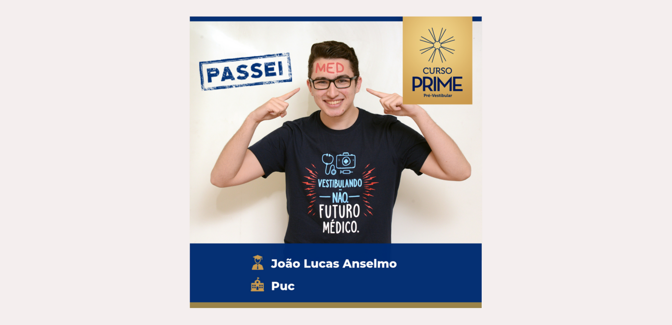 João Lucas está no seu segundo ano de cursinho no Prime e garante que a escola o ajuda a evoluir não apenas como estudante, mas também como pessoa. “Cheguei aqui totalmente ingênuo, perdido no meio de tantos conteúdos, sem estratégia para a guerra”, compara ele, que elogia a coordenadora pedagógica Marcia Chiréia e o professor de biologia Márcio Barbieri como principais motivadores. “Eles me ajudaram a evoluir e ter maturidade para encarar essa guerra. Entendi que tenho que começar do zero para chegar ao topo”, pontuou.